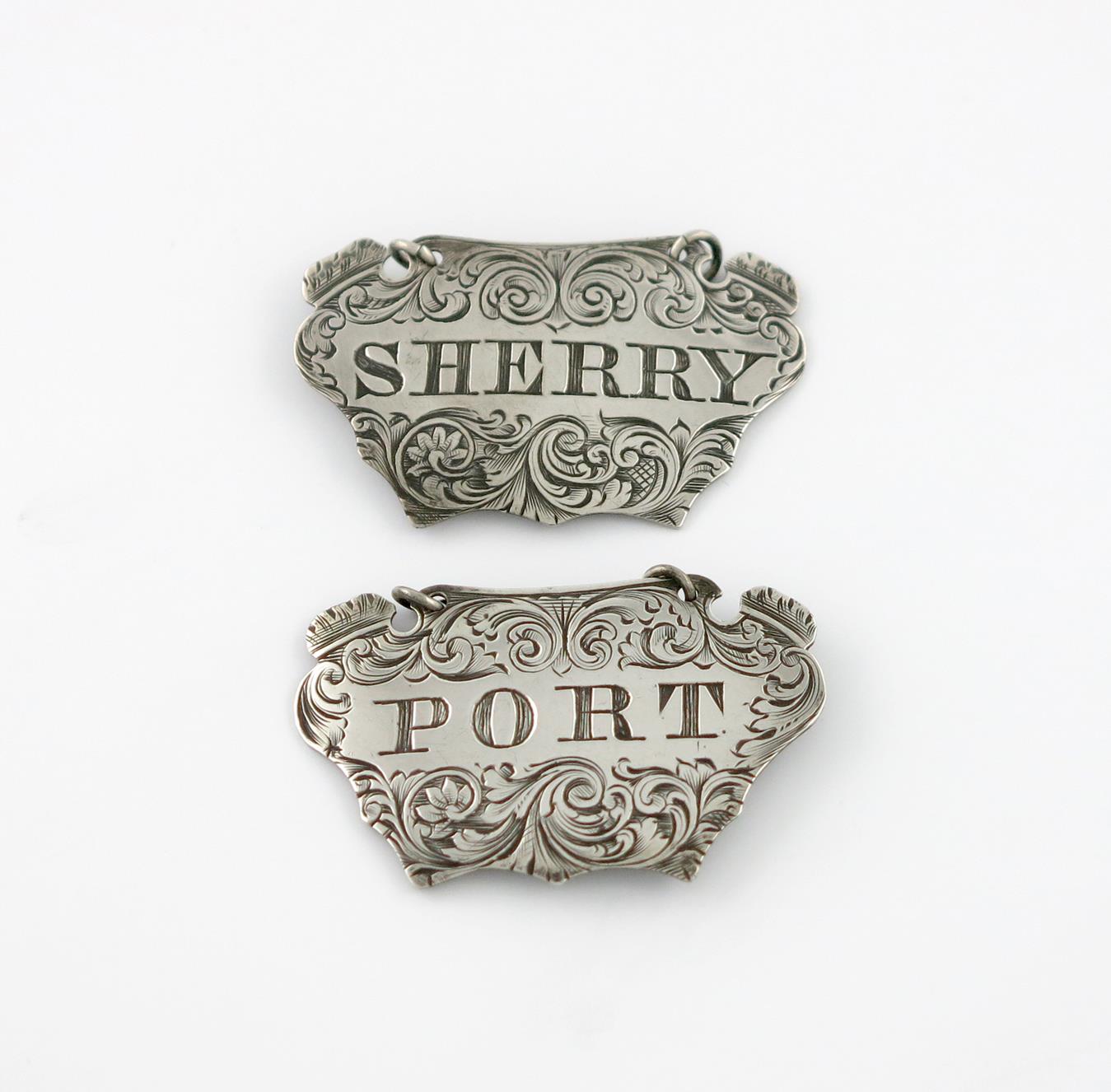 cartouche form, engraved foliate scroll decoration, incised 'SHERRY' and 'PORT', length 5.2cm, approx. weight 0.7oz. (2)