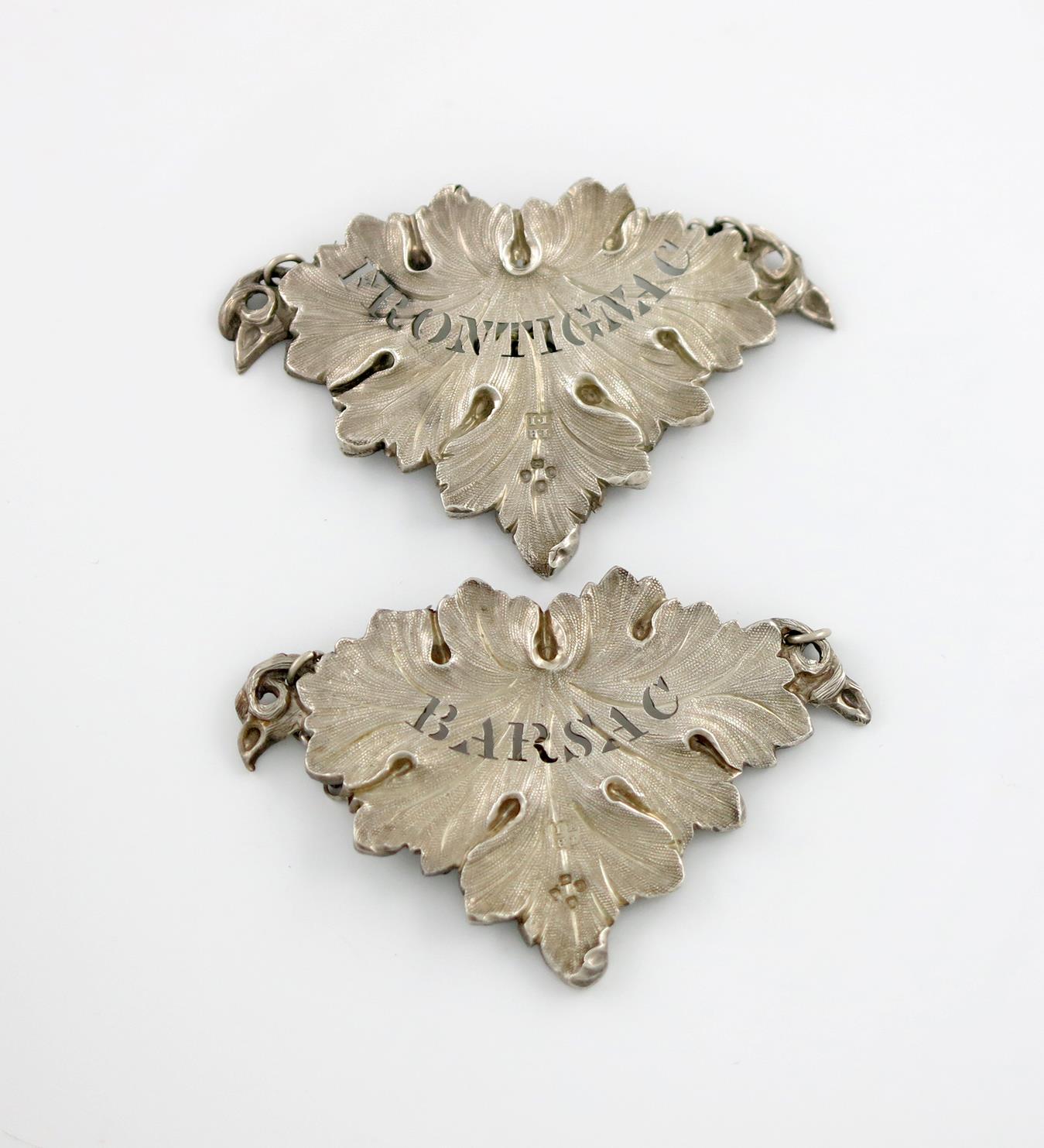 vine leaf form, pierced 'BARSAC' and 'FRONTIGNAC', length 9.3cm, approx. weight 1.5oz. (2)