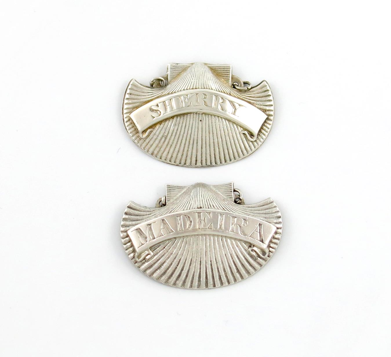 shell form, incised 'SHERRY' and 'MADEIRA', lengths 5cm and 5.3cm, approx. weight 0.6oz. (2)