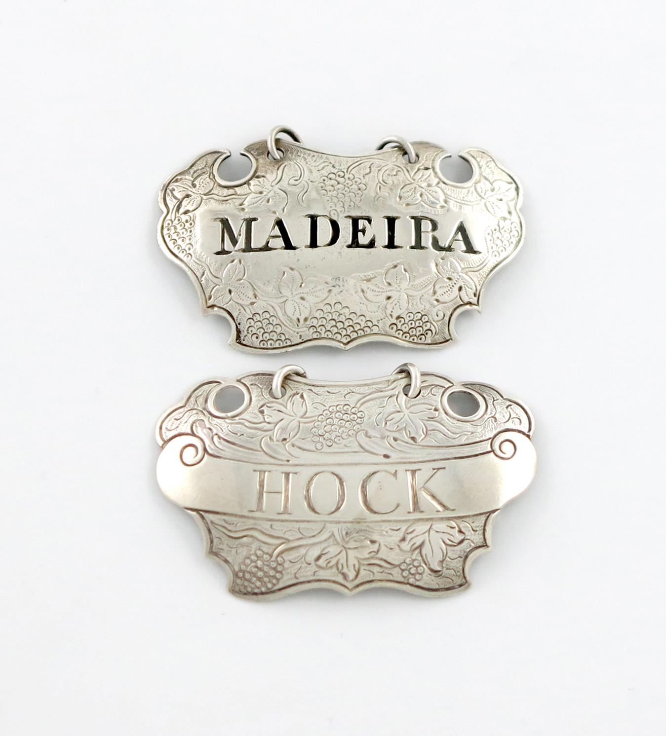 escutcheon form, chased vine decoration, incised 'HOCK', plus another George II provincial silver wine label, by James Lamb, Newcastle circa 1755, escutcheon form, chased vine decoration, pierced 'MADEIRA', approx. weight 0.8oz. (2)