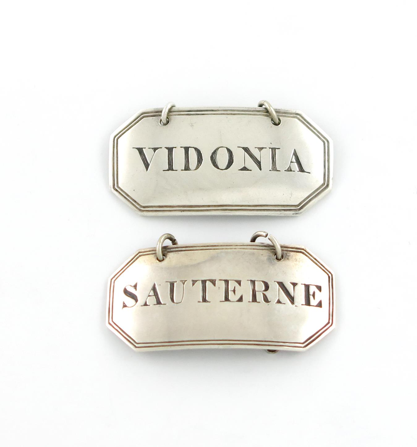 broad rectangular form, canted corners, incised and blackened 'SAUTERNE' and 'VIDONIA', length 4.6cm, approx. weight 0.6oz. (2)