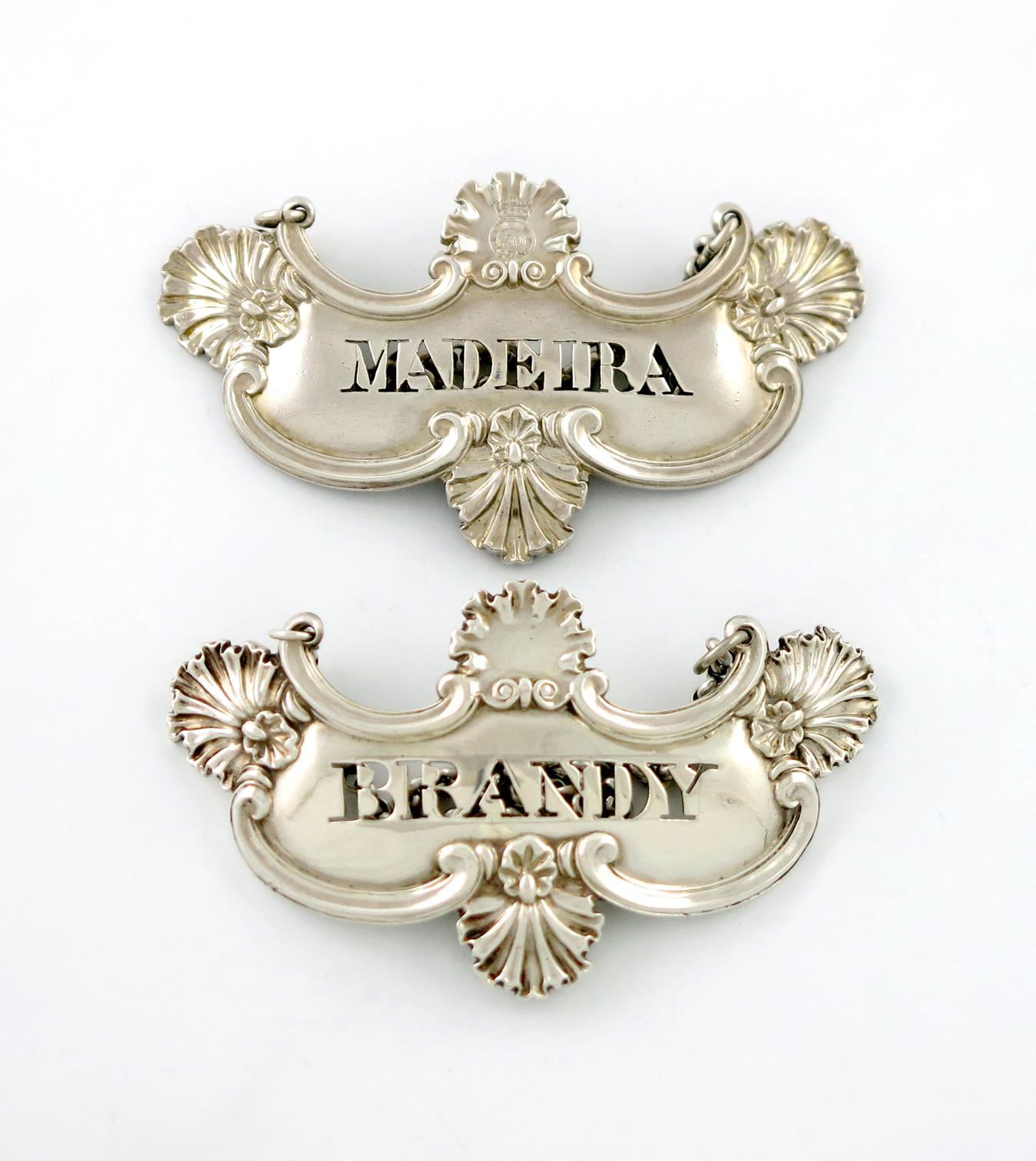 shaped scroll form, with shell mounts and engraved with the badge of the 50th Regiment, pierced 'MADEIRA', length 8.5cm, plus a similar wine label, re-titled 'BRANDY', marks possibly lost in re-titling, approx. weight 2.3oz. (2)