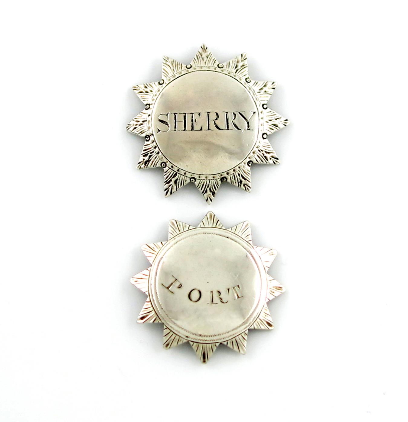 bright-cut star form, incised 'PORT', plus another similar, by Susanna Barker, London circa 1790, incised 'SHERRY', length 4.2cm, approx. weight 0.8oz. (2)