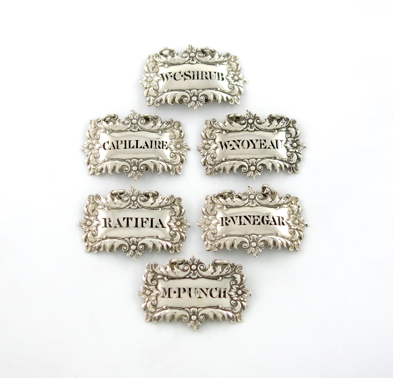 shaped broad rectangular form, foliate borders, pierced 'W.C SHRUB', 'W. NOYEAU', 'RATIFIA', 'CAPILLAIRE', 'M.PUNCH', and 'R. VINEGAR', length 5cm, approx. weight 3.3oz. (6)