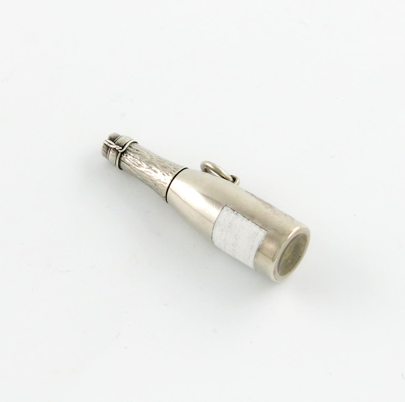 modelled as a champagne bottle, faded enamel label, 'Zoedone, non-alcoholic aerated iron beverage, brain and nerve tonic, sole manufacturer The Zoedone Co. Wrexham', with a ring attachment, length 4.5cm, approx. weight 0.5oz.