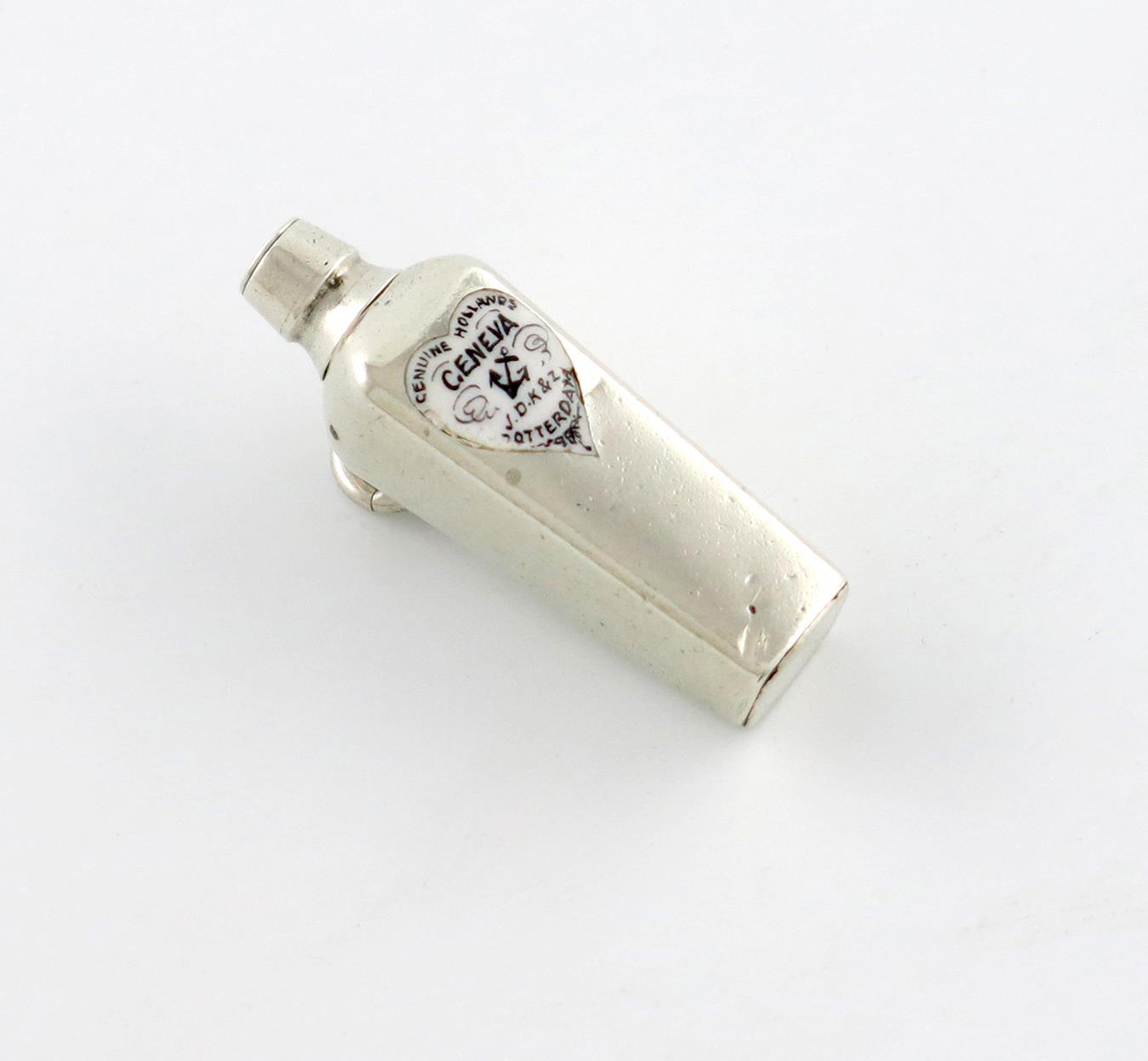 modelled as a gin bottle with an enamelled label 'Genuine Hollands, GENEVA, J.D.K. &Z, Rotterdam', with a ring attachment, length closed 3.8cm, approx. weight 0.4oz.