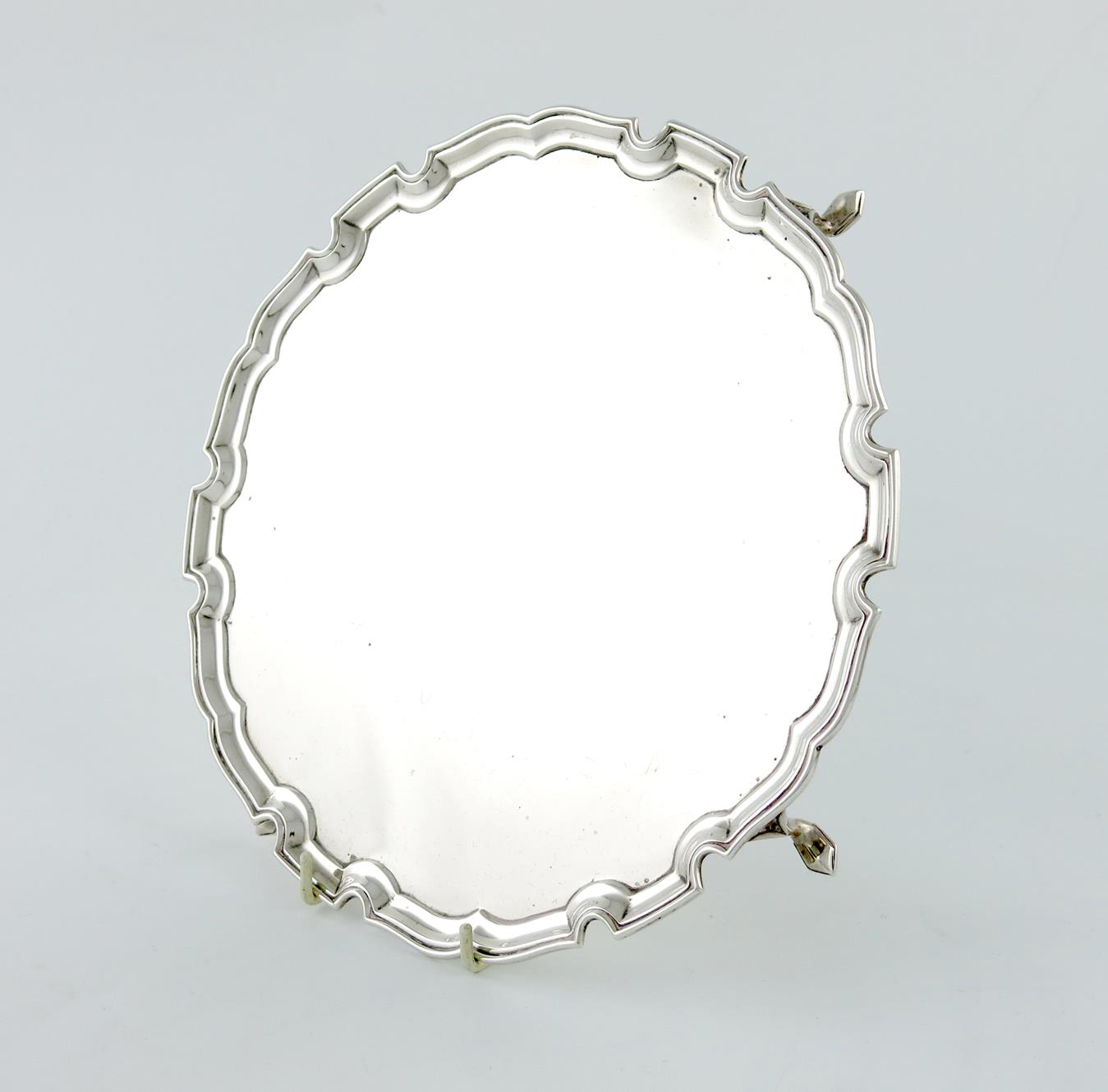 circular form, moulded border, on four scroll feet, diameter 25.3cm, approx. weight 20.5oz.