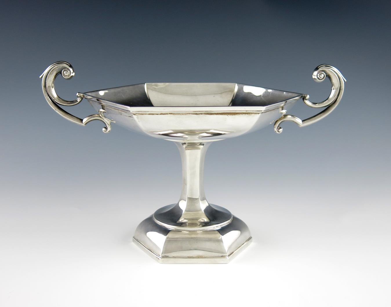 hexagonal form, scroll handles, on a raised hexagonal base, height 19cm, approx. weight 22.5oz.