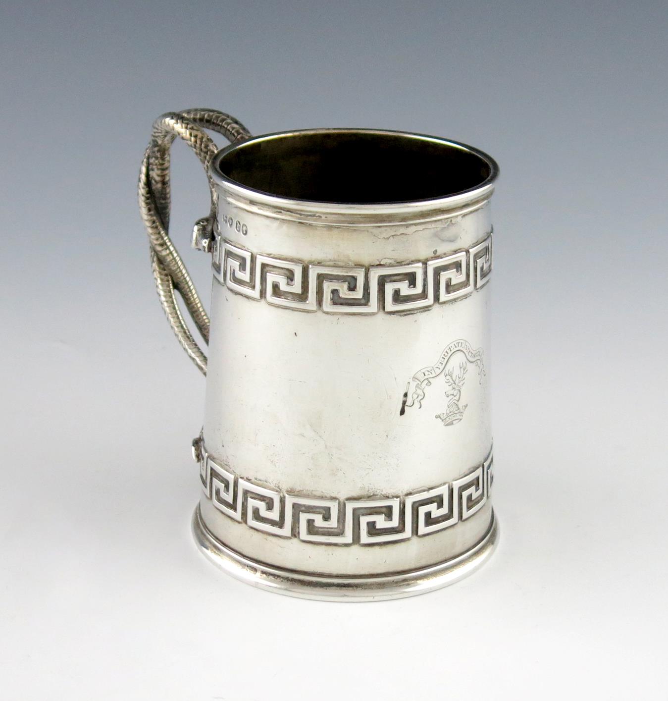 tapering circular form, bifurcated double snake scroll handle, Greek key upper and lower border, engraved with a crest and motto, height 12cm, approx. weight 13.6oz.