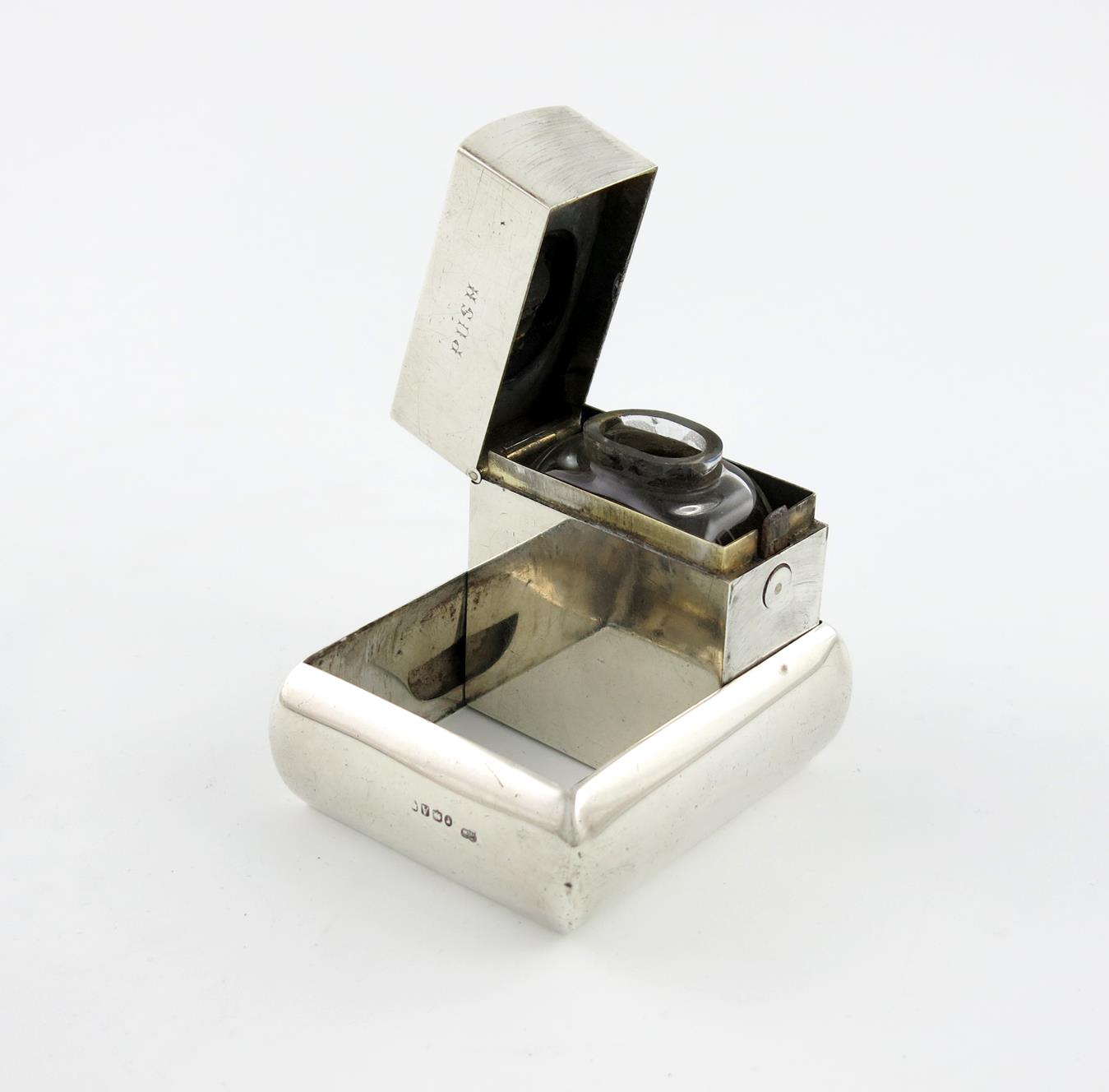 rounded rectangular form, the push action mechanism reveals a pop up inkwell with a hinged cover, the interior with a clear glass ink bottle, length 8cm, approx. weight 7.9oz.