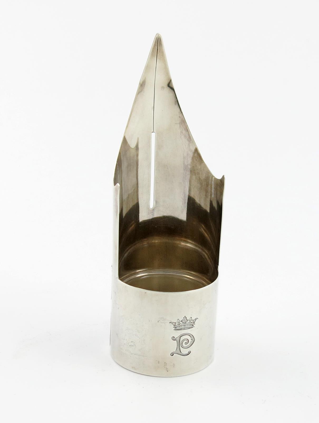 the front with a crowned initial, with a pen rest, later glass liner, height 13.8cm, approx. weight 2.1oz.