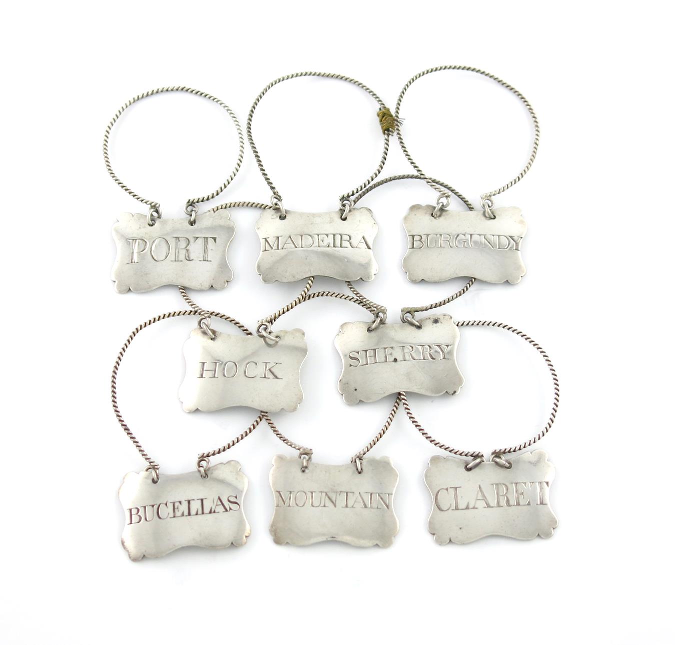 cartouche form, rope-work rings, incised 'MOUNTAIN', 'BURGUNDY', 'MADEIRA' 'PORT', 'CLARET', 'BUCELLAS' 'SHERRY' and 'HOCK', approx. weight 5oz. (8)