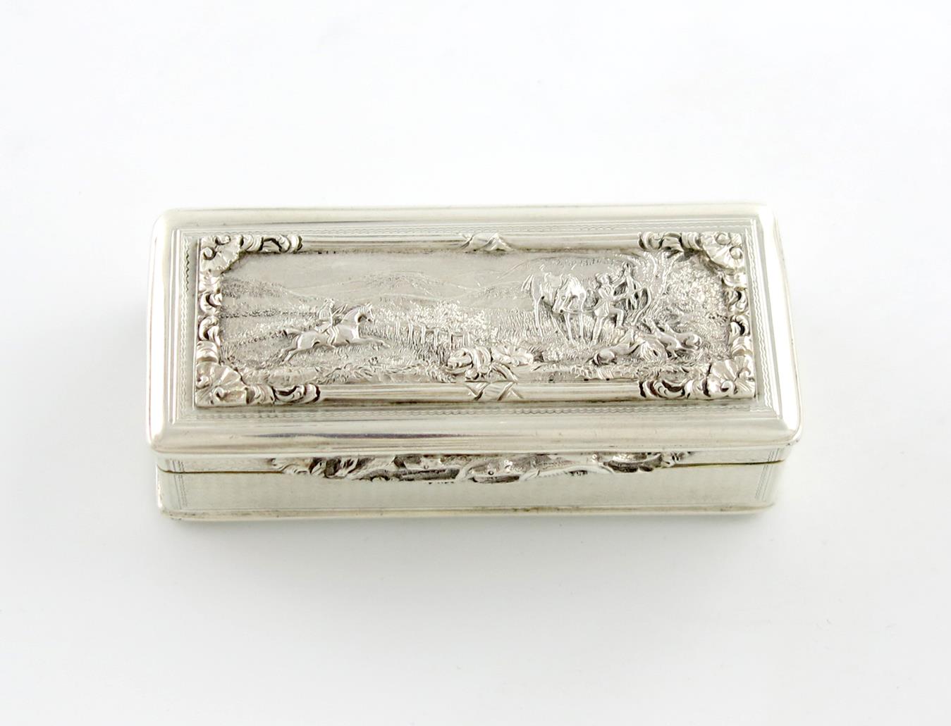rectangular form, engine-turned sides and base, the hinged cover with a cast relief panel of a hunting scene, within an engraved border, gilded interior, length 8.3cm, approx. weight 3.3oz.