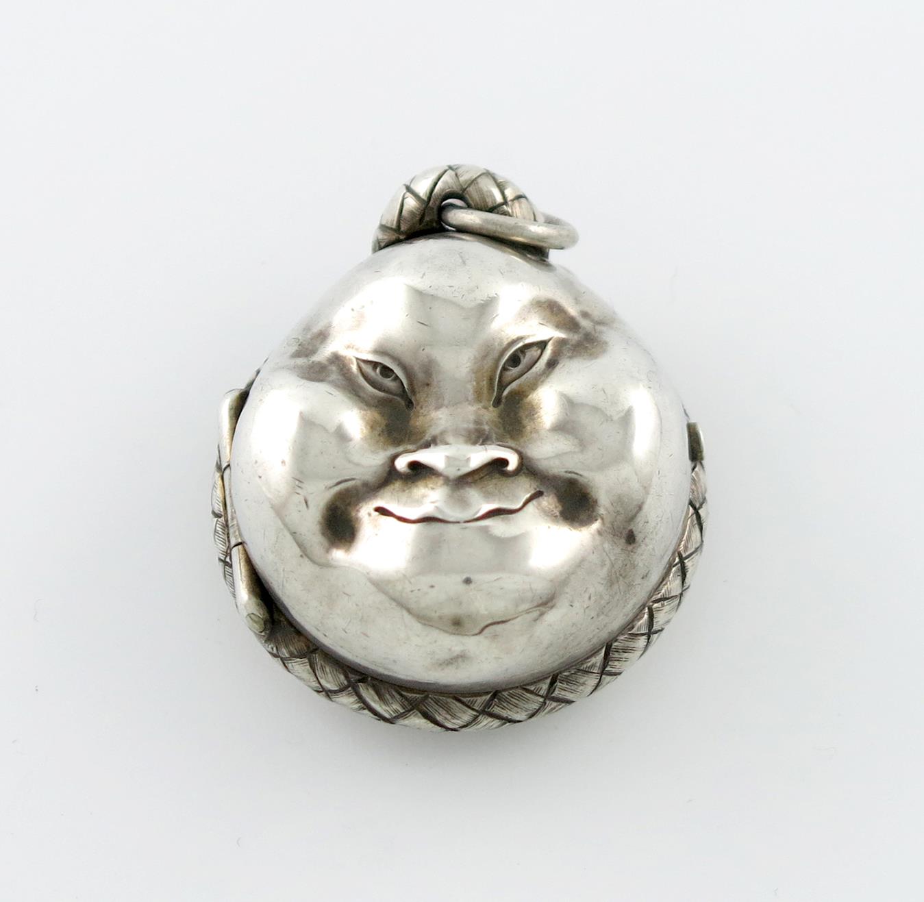 circular form, modelled as a caricature Japanese male head with a textured hair border, with a ring attachment, the interior silver-gilt and with a sprung sovereign holder, length 4.2cm, approx. weight 1.7oz.