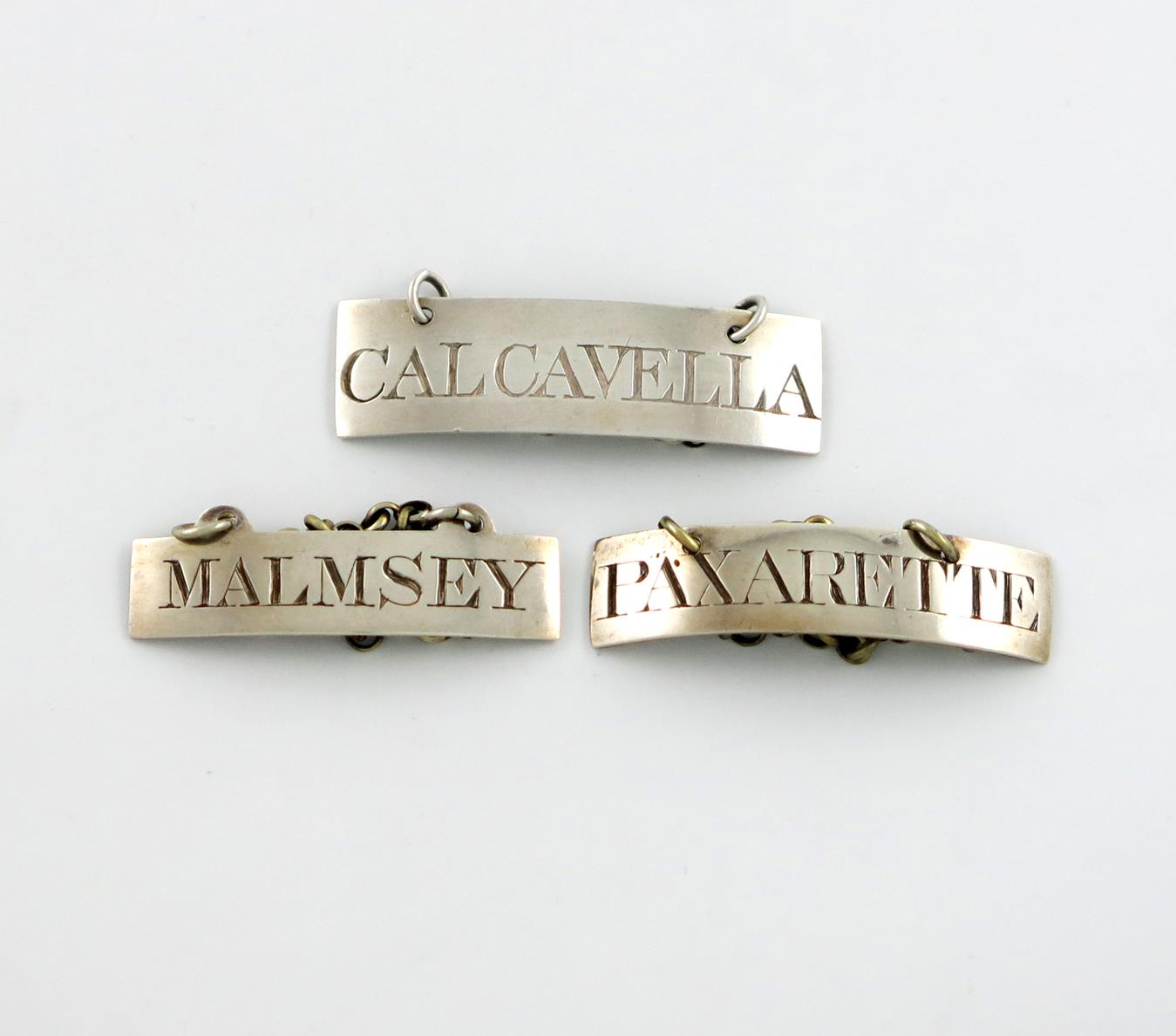 narrow rectangular form, incised 'MALMSEY', plus a George III silver wine label, by Susanna Barker, London 1793, incised 'PAXARETTE', and one 'CALCAVELLA', approx. weight 0.6oz. (3)