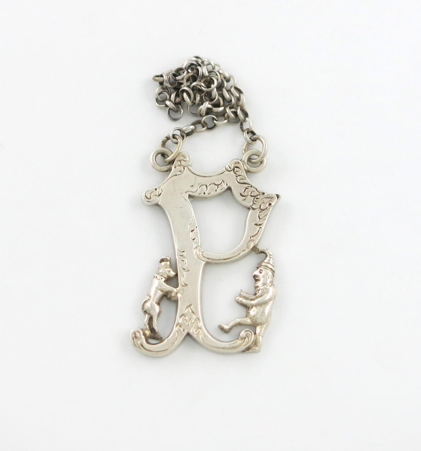 modelled as the letter P, with foliate decoration, and supported by Mr. Punch and Toby the dog, length 4.4cm, approx. weight 0.45oz.