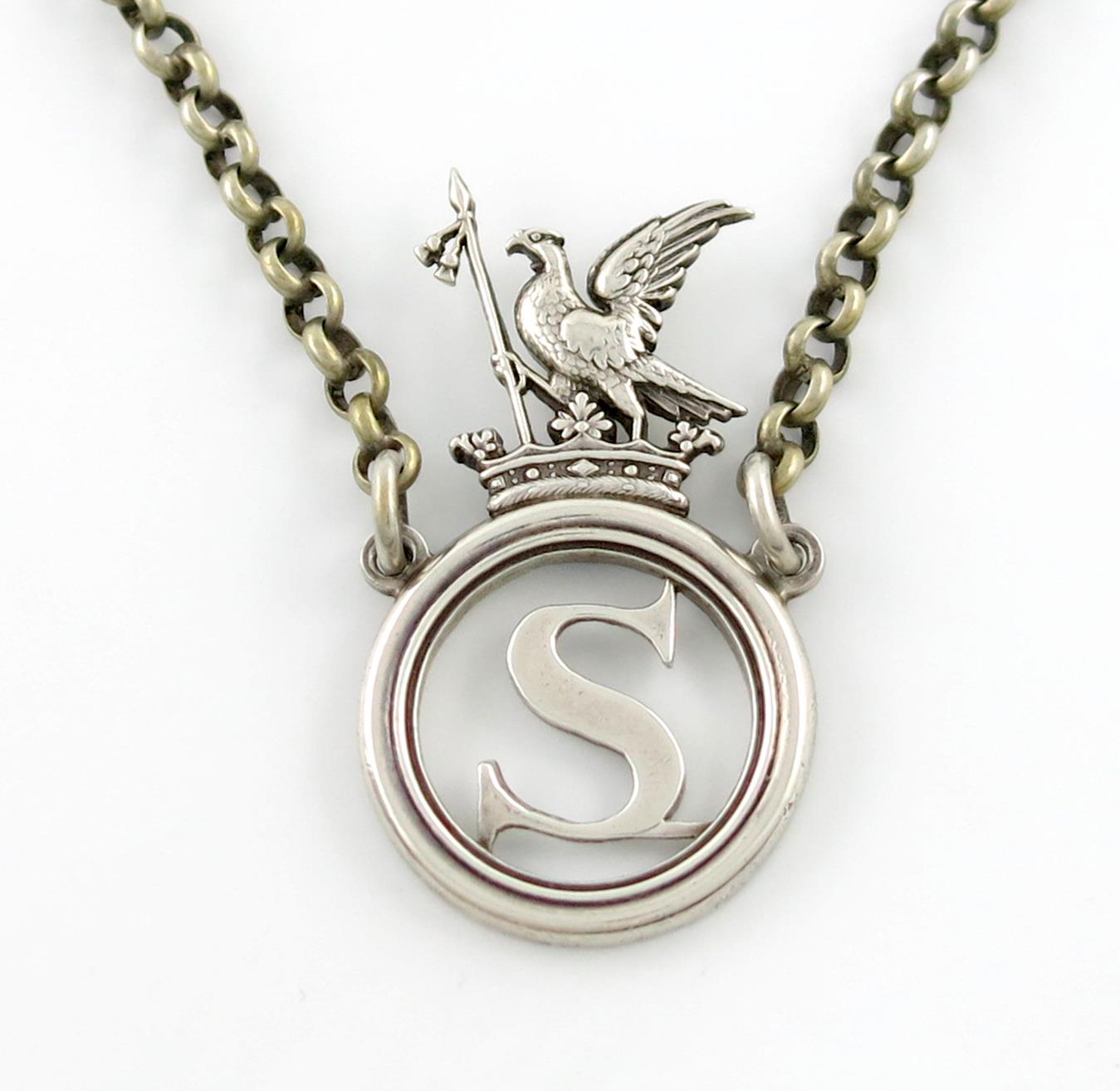 modelled as the letter 'S' within a circular frame mounted with the crest of a bird and crown, length 5cm, approx. weight 0.7oz.
