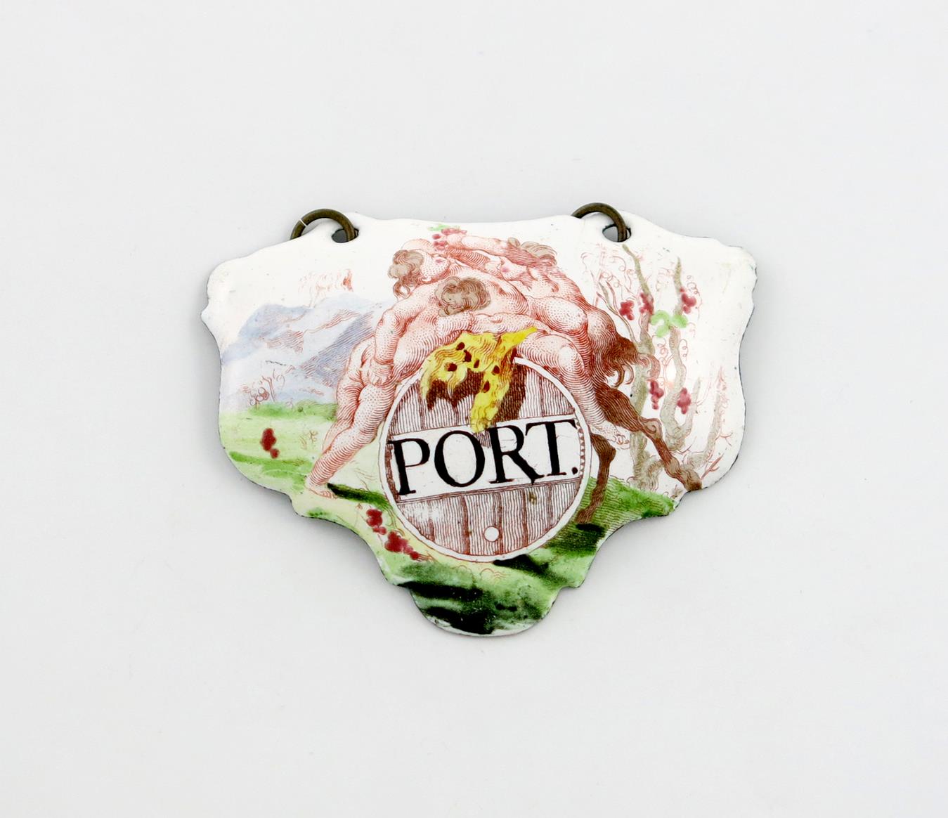 The Battersea factory at York House was founded in 1753 by the partnership of Janssen, Delamain and Brooks, aiming to make use of a process to transfer engraved designs onto enamel. Wine labels were amongst the range of luxury goods produced before the closure of the factory in 1755 or 1756. Amongst the lots at Jannsen's bankruptcy sale in 1756 were 'Bottle tickets with Chains for all sorts of Liquor, and of different subjects...'. There appears to be seventeen different designs and around forty different recorded titles.