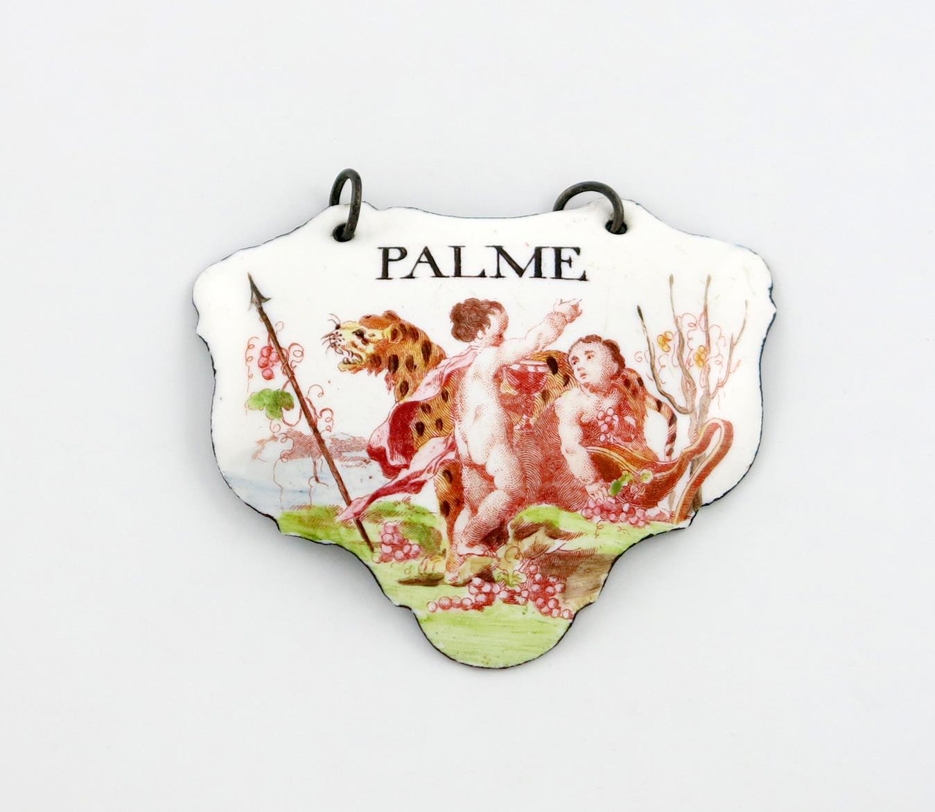 escutcheon form, with two cupids in front of a leopard, with a spear to the left, below the title 'PALME', length 7cm.