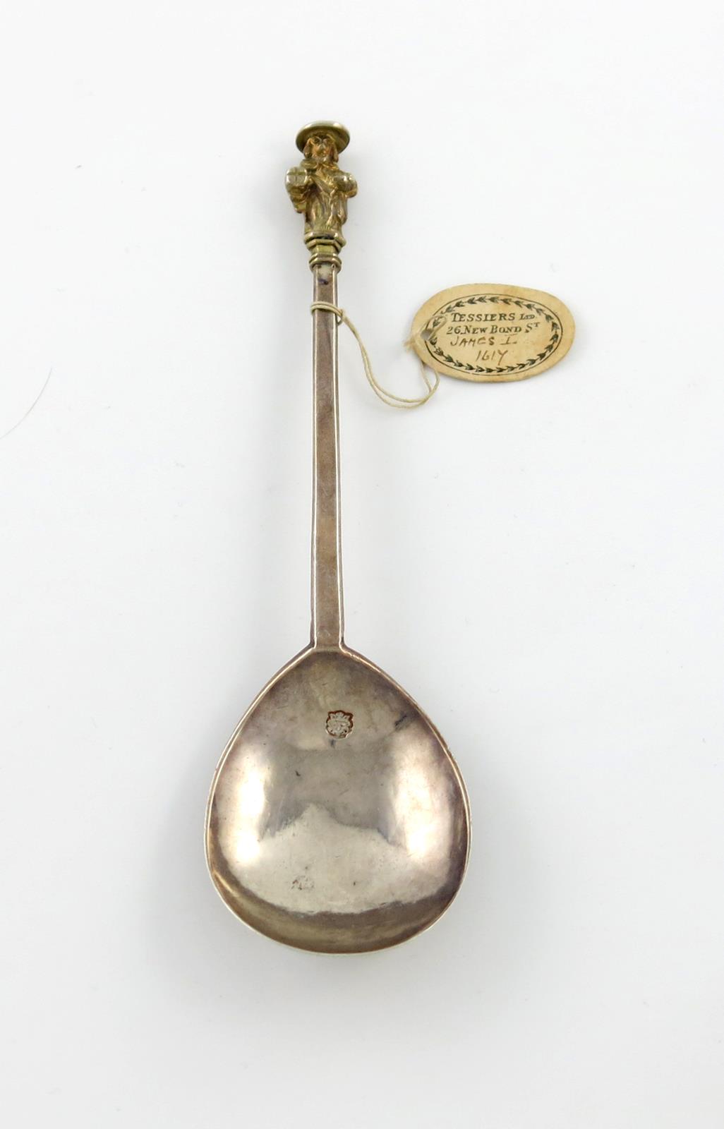 fig-shaped bowl, slightly tapering faceted stem, gilded apostle finial, the nimbus with a dove, the reverse of the bowl with prick-dot initials 'B.G' over 'L.W', '1635', length 18.2cm, approx. weight 1.7oz.