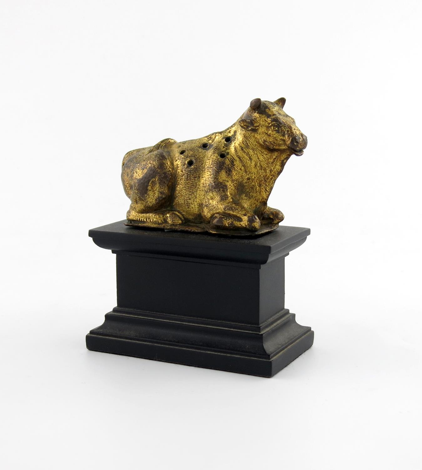 modelled as a recumbent bull, the back pierced with holes, on a later wooden stand, height on plinth 12.2cm, length 9.8cm.