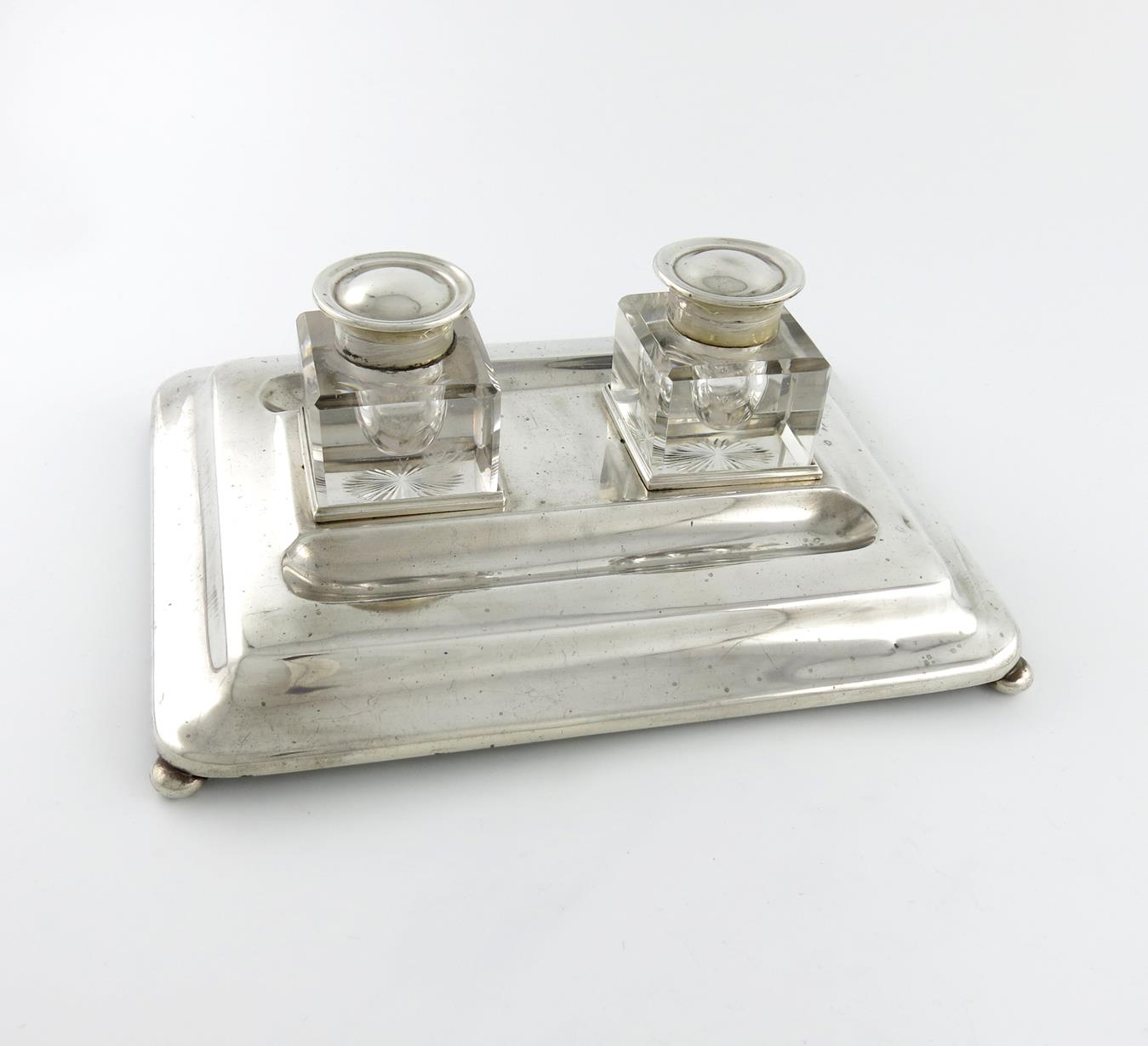 rectangular form, with two pen wells and with two silver-mounted glass inkwells, on four bun feet, length 31.5cm, approx. weight 26oz.