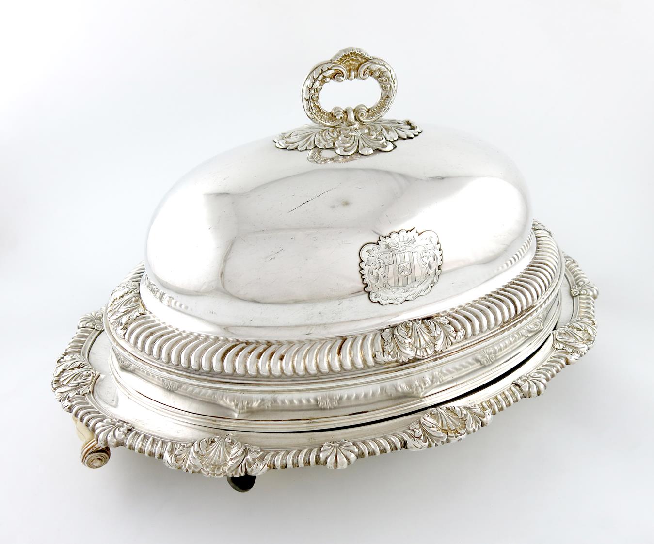 oval form, shell and gadroon border, fluted scroll handles with ivory grips, on four ivory bun feet, the domed pull-off cover with a fluted and shell border, central foliate carrying handle, with a water compartment, applied with a crest, length of base 56cm. (2)