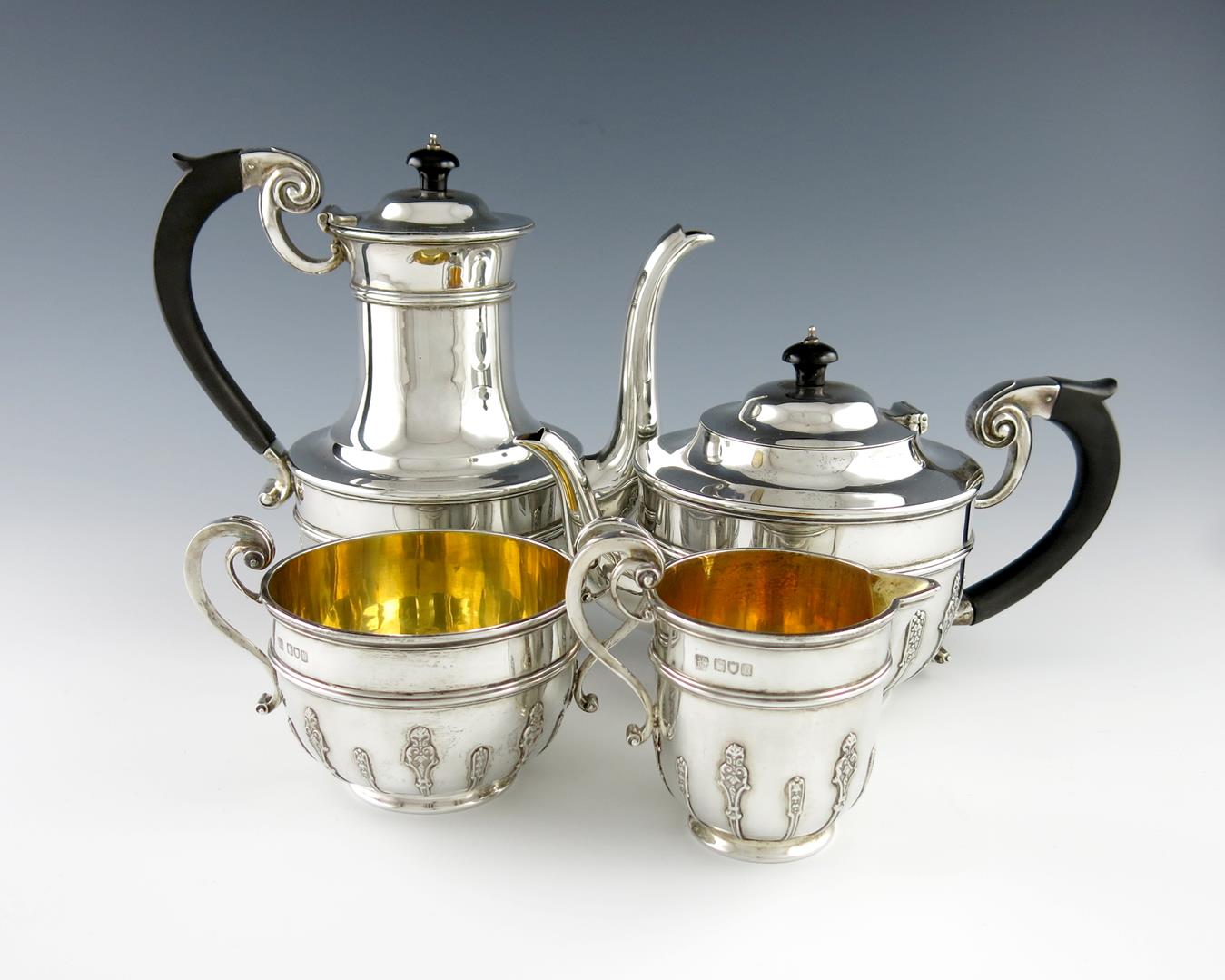 circular form, central girdle above cut-card decoration, scroll handles, domed hinged covers, on a circular foot, height of coffee pot 21cm, approx. weight 67.5oz. (4)