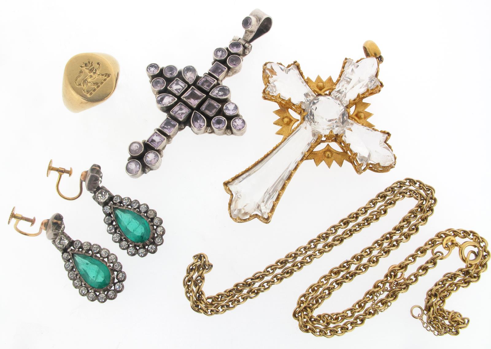 A small jewellery box containing a rock crystal mounted gold cross pendant, a gold signet ring, a pair of green and white paste earrings, a gold neck chain and an amethyst mounted silver cross pendant.