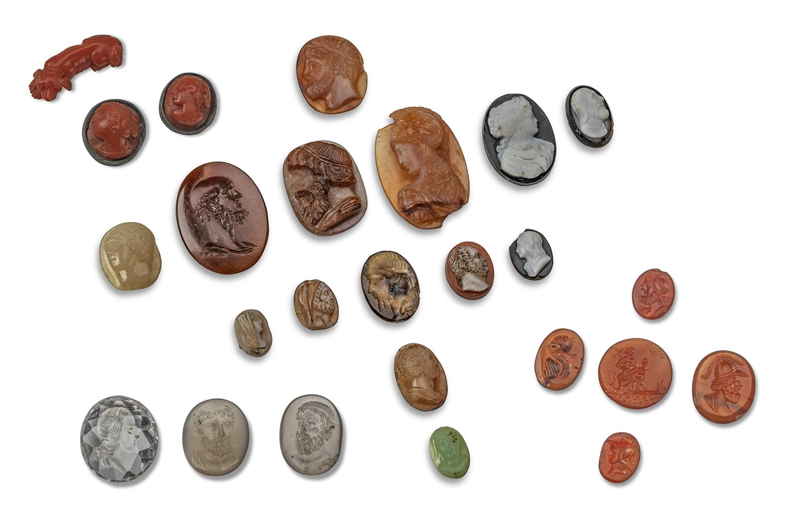 A nineteenth century carved coral figure of a reclining dog, 3.0cm long. And two carved coral cameos depicting female profiles. Metal mounts, both 1.7cm high. Two late 18th century carved rock crystal intaglios, depicting two bearded men, possibly philosophers. Both 1.7cm high. And a late 18th century carved and reverse-faceted rock crystal intaglio depicting a man's profile. 1.9cm high. A 17th century carved circular carnelian intaglio, depicting a Christian scene with a seated figure holding a cross and a chalice. 1.8cm wide. A 1st to 2nd century AD carved oval intaglio depicting Zeus. Chip to top border. 1.2cm high. A 3rd to 4th century Sicilian carved intaglio depicting a warrior. 1.5cm high. And two 17th century carved intaglios of warriors wearing helmets. 1.8 and 1.2cm high. And a group of fourteen carved hardstone intaglios and cameos, mostly 17th-19th century.