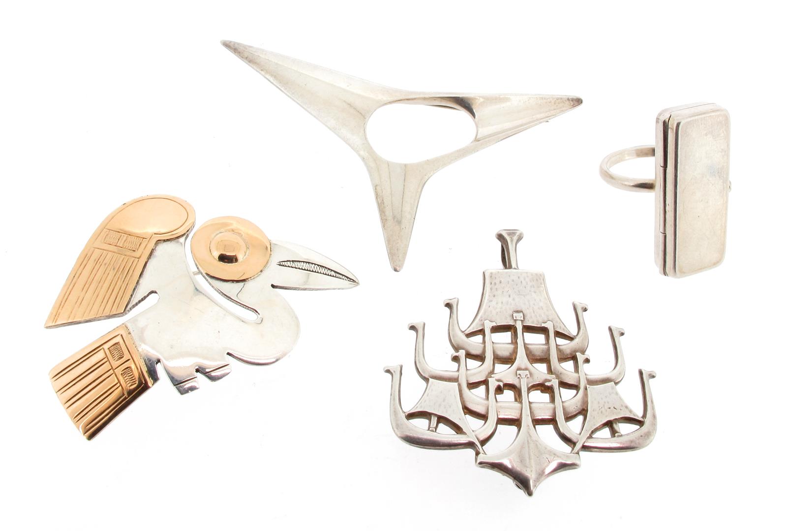 A Georg Jensen silver Henning Koppel Modernist brooch, signed with design number 342. 7.8cm wide. A Georg Jensen silver pillbox ring, signed with design number 146. 3.1cm long. Size N. A silver Viking ship brooch pendant by David Andersen, signed to the reverse with initials DA. 5cm high. And a silver stylised toucan silver brooch with gilt decoration. 5.5cm long.