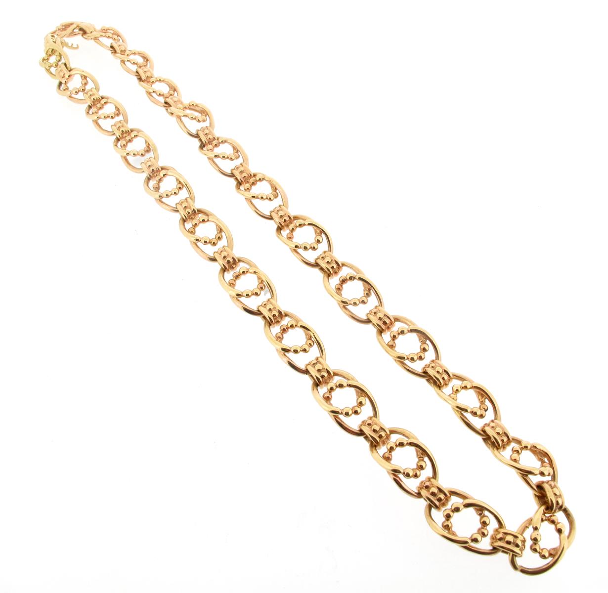 A fancy-link gold chain, signed Garrard and inscribed 'oneonetwo'. With London import marks for 18ct gold and dated 1989. 43.5cm long. 64g.
