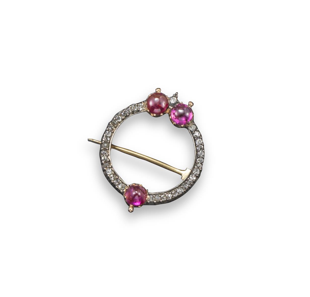 A diamond and ruby circular brooch by Giuliano, set with small cushion-shaped diamonds and three cabochon rubies in silver and gold. Signed under the pin hinge. C&AG. 2.2cm wide.