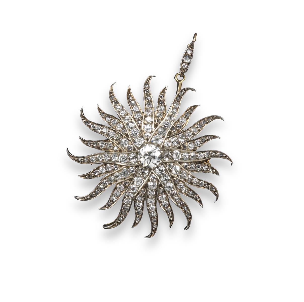 A late Victorian diamond set Sun in Splendour brooch pendant, the curved rays are set with graduated circular-cut diamonds and centred with a larger old circular-cut diamond in silver and gold. Detachable brooch and pendant fittings. 4cm wide. Fitted case.
