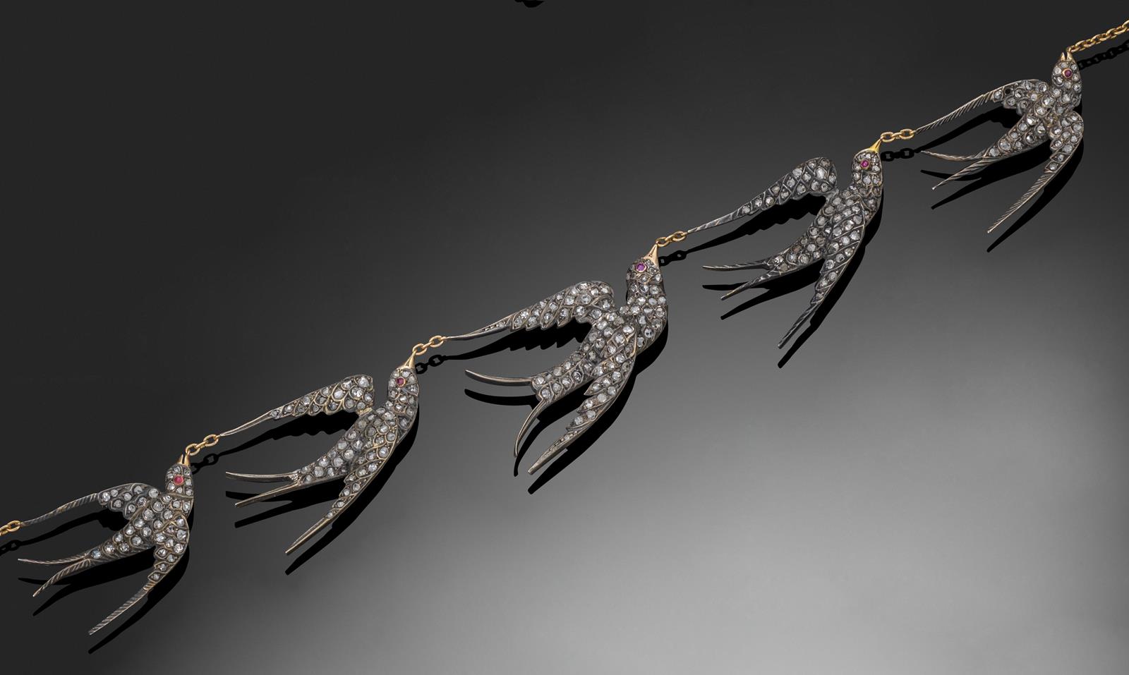 A necklace formed with five 19th century diamond set swallows in flight, all pave-set with rose cut diamonds and with ruby eyes and joined with fine link gold chain. The necklace 39.5cm.