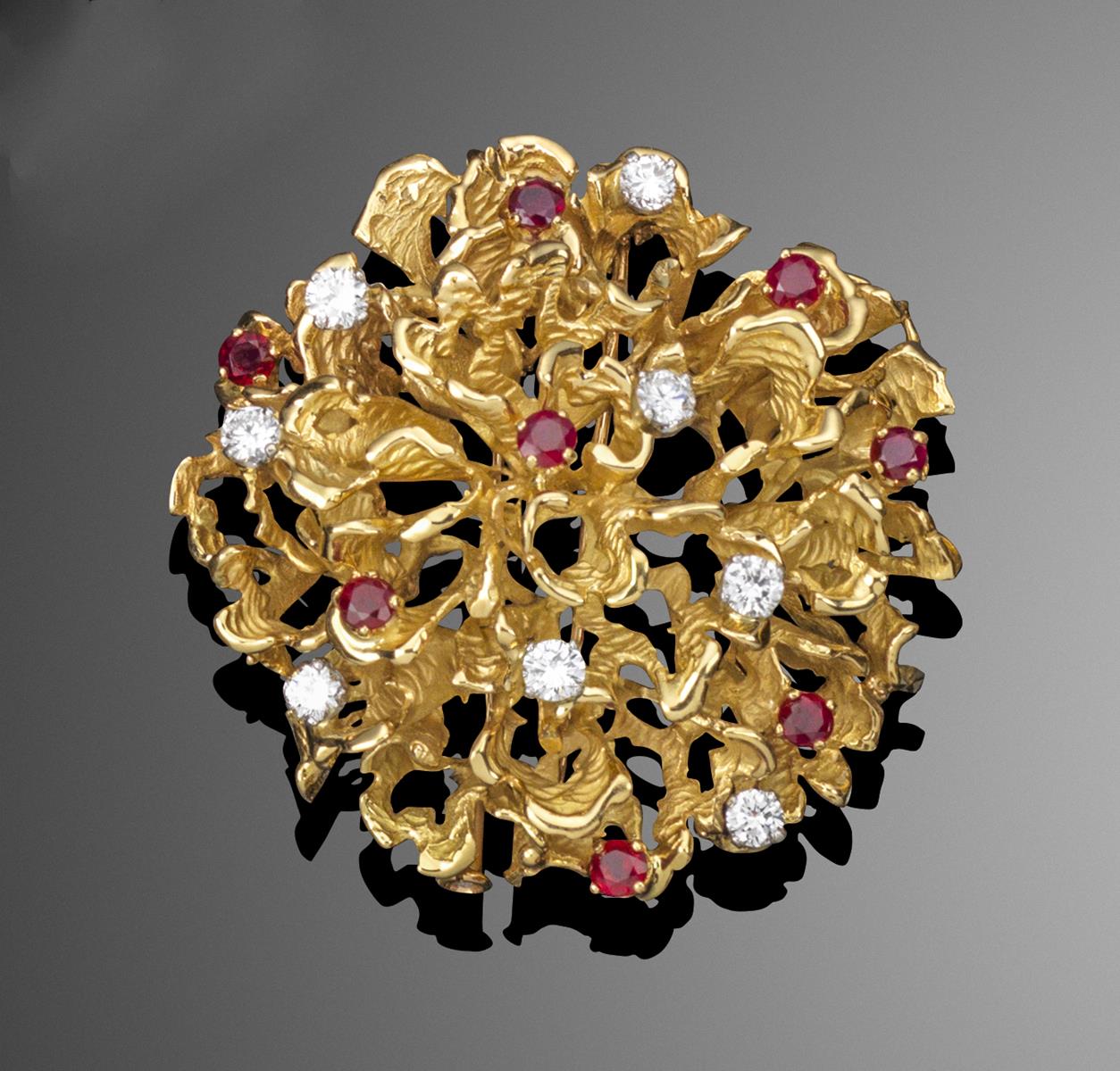 A stylised gold flower head brooch, set with circular cut rubies and diamonds. Signed to the reverse Boucheron Made in France. 5cm wide.