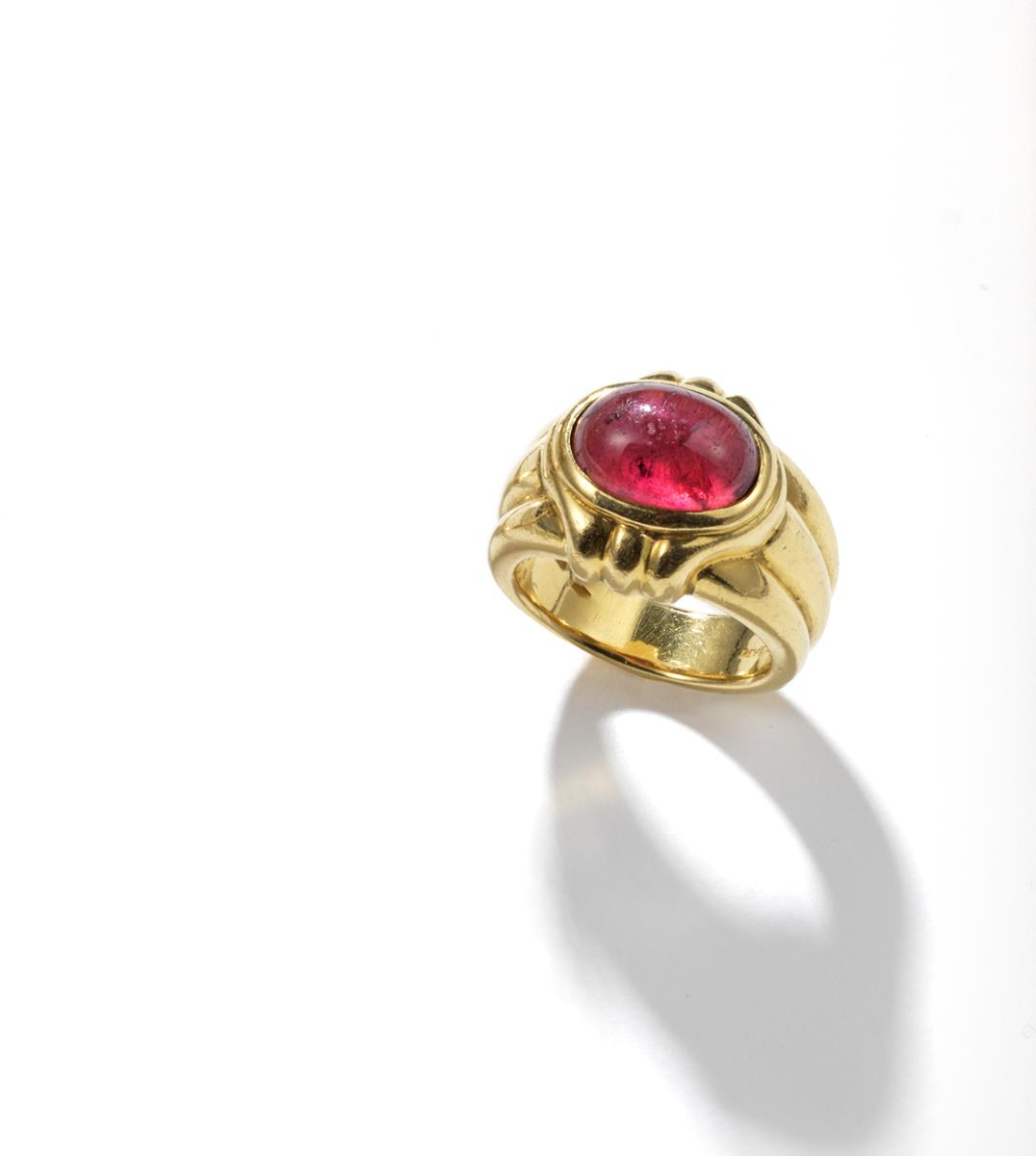 A tourmaline and gold ring by Bulguri, the oval-shaped cabochon pink touramline is set in yellow gold with heavy fluted shoulders and shank. Signed Bulgari. Size I 1/2. With Bulgari case.