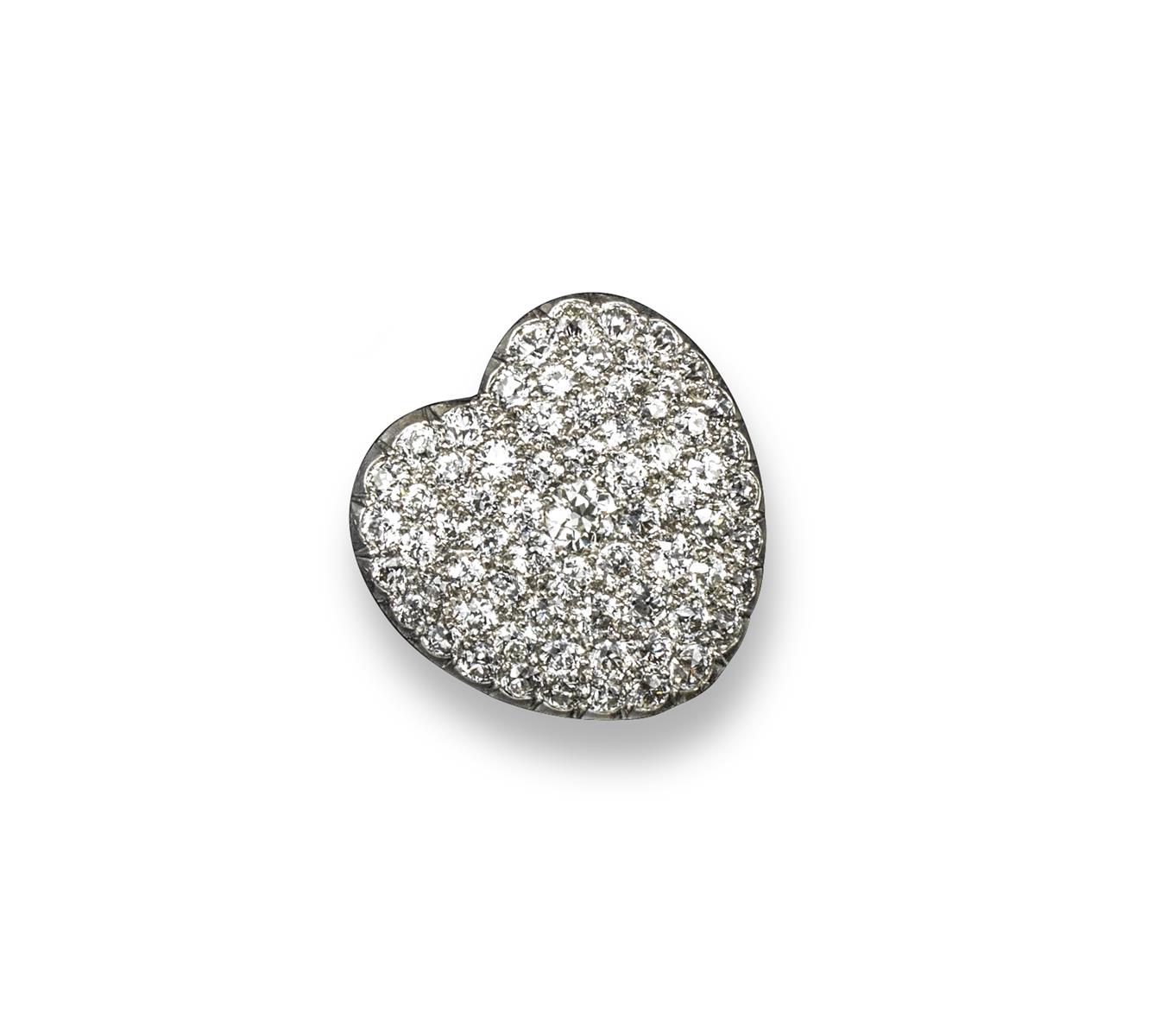 An early 20th century diamond set heart brooch, pavé-set overall with graduated transitional circular-cut diamonds in platinum and gold. The centre diamond weighs approximately 0.40cts. Fluted yellow gold border to the reverse. 2.6cm wide. Fitted case.