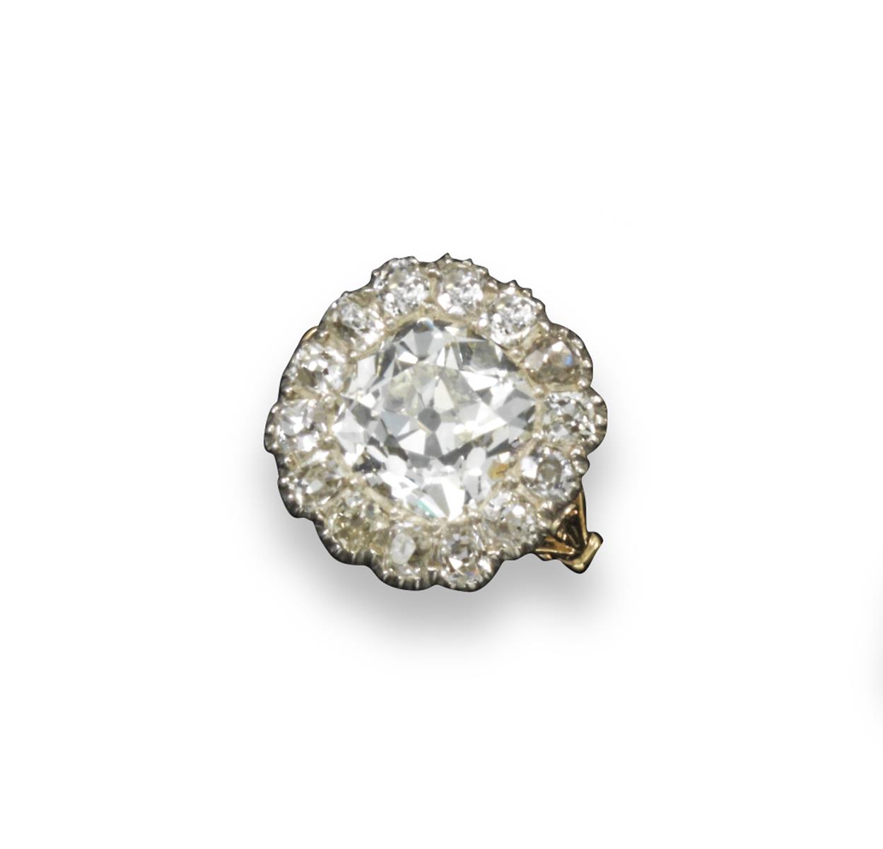 A diamond cluster ring, the centre cushion-shaped diamond weighs approximately 5.00cts and is set in a surround of fourteen smaller cushion-shaped diamonds in silver and gold. Pierced shank with stylised fleur-de-lys shoulders. Size J. (Including sizing sleeve to the inner shank).