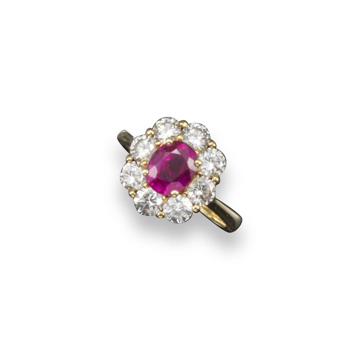 A ruby and diamond cluster ring, the oval-shape ruby is set within a surround of eight round brilliant-cut diamonds in gold. Size N (including re-sizing balls).