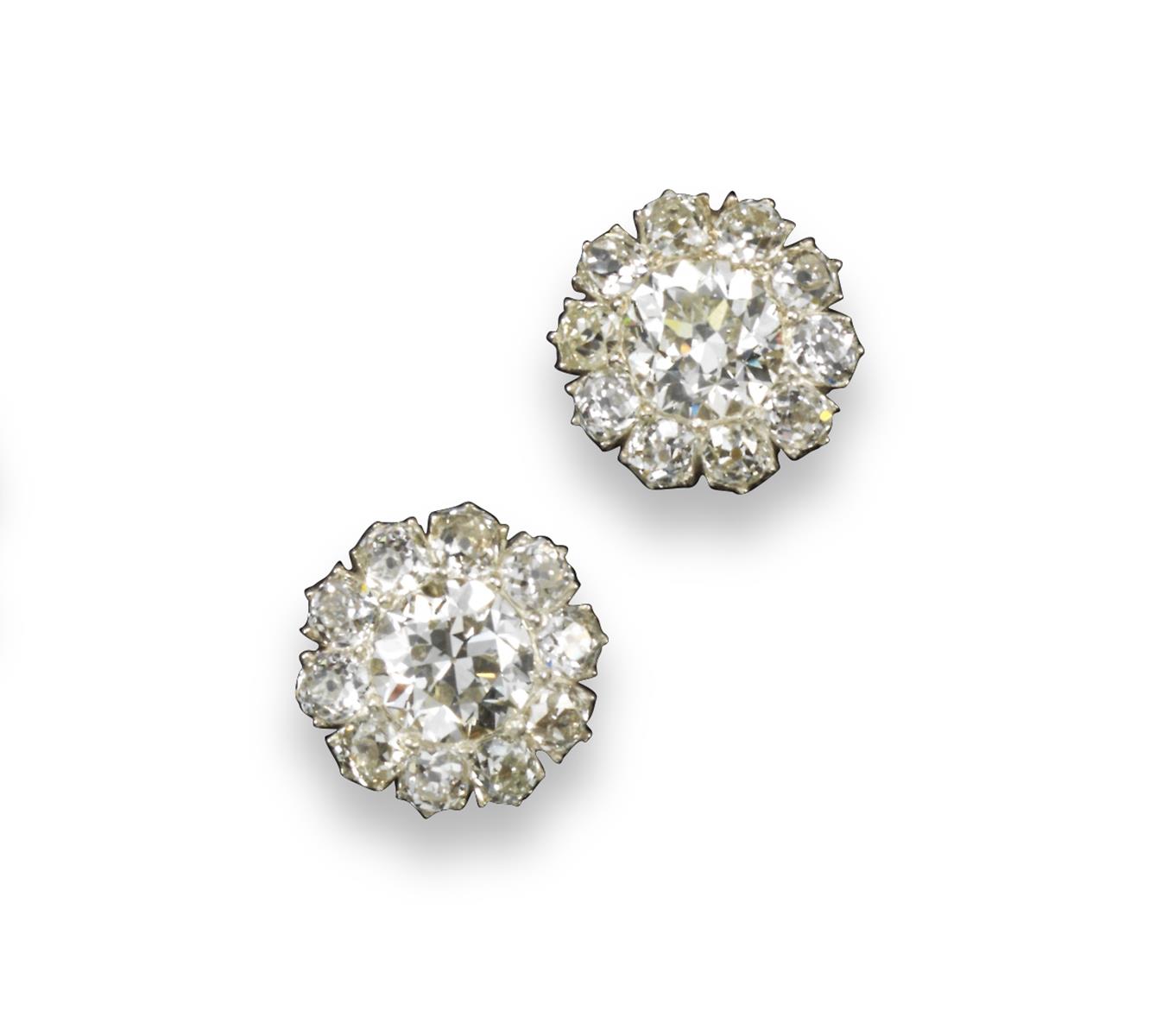 A pair of diamond cluster earrings, the old round brilliant-cut diamonds are each set with ten smaller cushion-shape diamonds in silver and gold. The principle two diamonds weigh approximately 5.00cts in total.