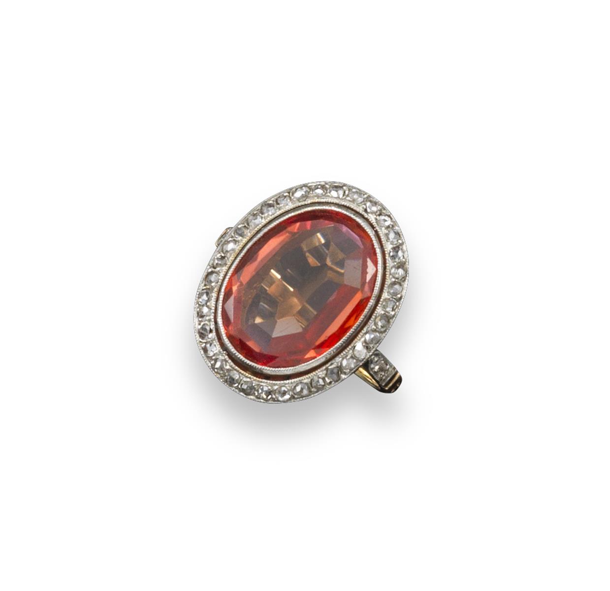 A fire opal and diamond ring, the oval-shaped fire opal is millegrain set within a border of rose-cut diamonds in platinum and yellow gold. Size J.