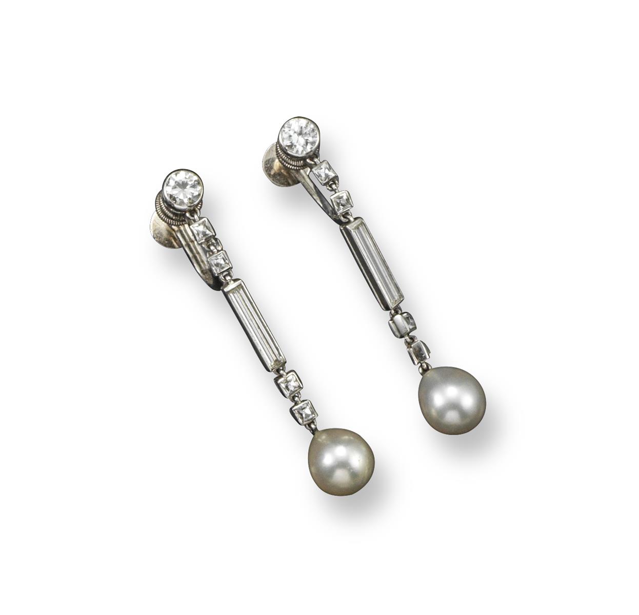 A pair of diamond and natural pearl drop earrings, each pearl suspends from a long baguette shaped diamond with four articulated calibre cut diamonds and a larger round brilliant cut diamond in platinum.