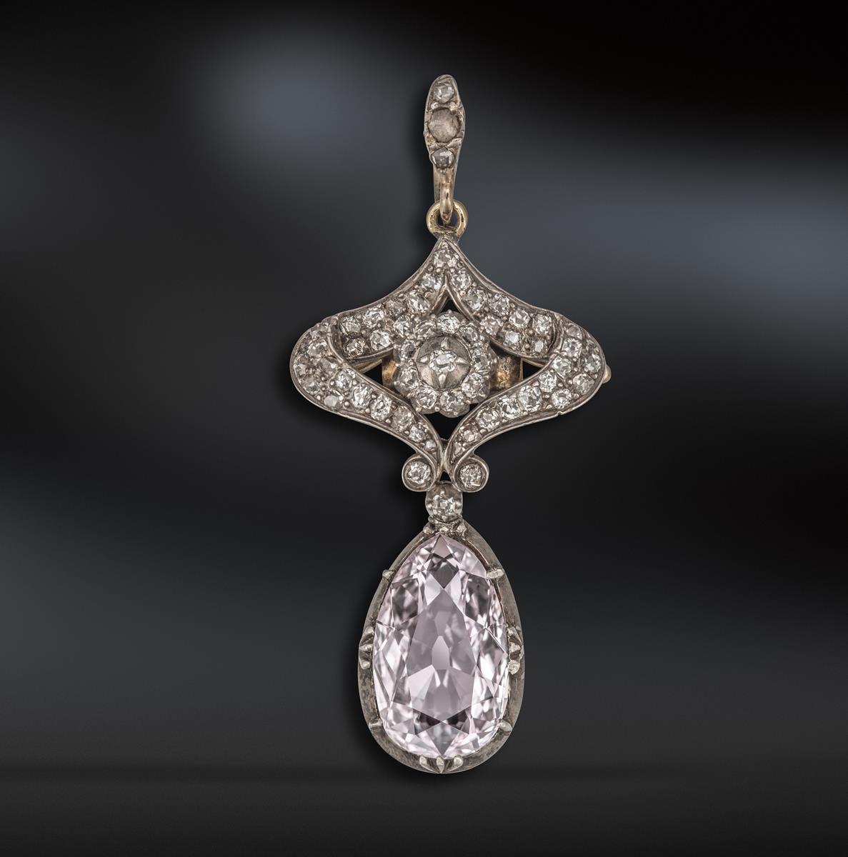 An Art Nouveau pink and white diamond pendant, the pear-shaped pink diamond weighs 2.77cts and suspends from a scroll mount set with graduated cushion-shaped diamonds. Fitted case by Paris of Liverpool.