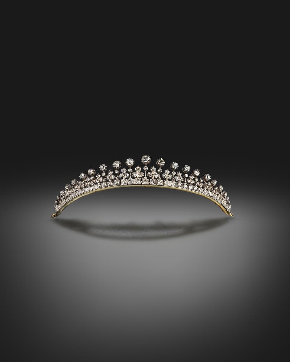 A late 19th century fringe necklace converting to a tiara, the line of thirty seven old cushion-shaped diamonds alternately suspend a trefoil of diamonds and a diamond drop, each with two graduated old circular-cut diamonds in silver and gold. On a detachable pierced knife-edge chain, each section set with a rose-cut diamond. With stamped inventory number 19926. In fitted case by Cartier. The box contains the original fitting so that the fringe section can we worn as a tiara.