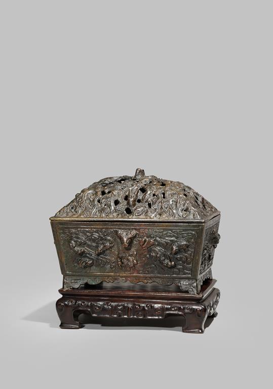 A CHINESE BRONZE RECTANGULAR 'FIVE DRAGON' INCENSE BURNER AND COVER 17TH CENTURY The reticulated...
