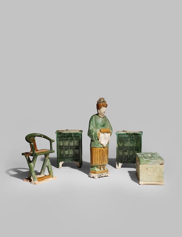 A CHINESE POTTERY FIGURE AND FOUR POTTERY ITEMS OF FURNITURE
