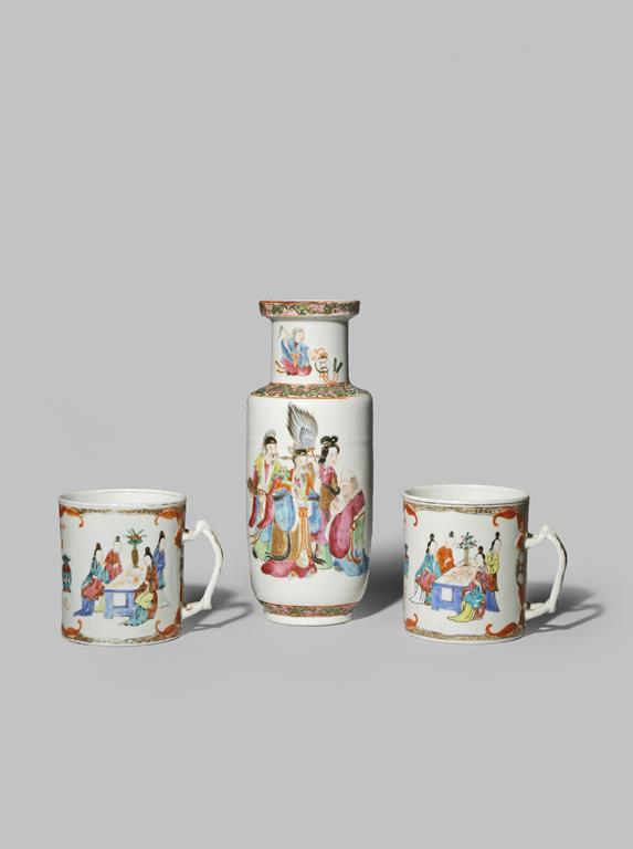 Each painted with figures in an interior, and a small rouleau vase painted with Immortals, 25.5cm max. (3)
