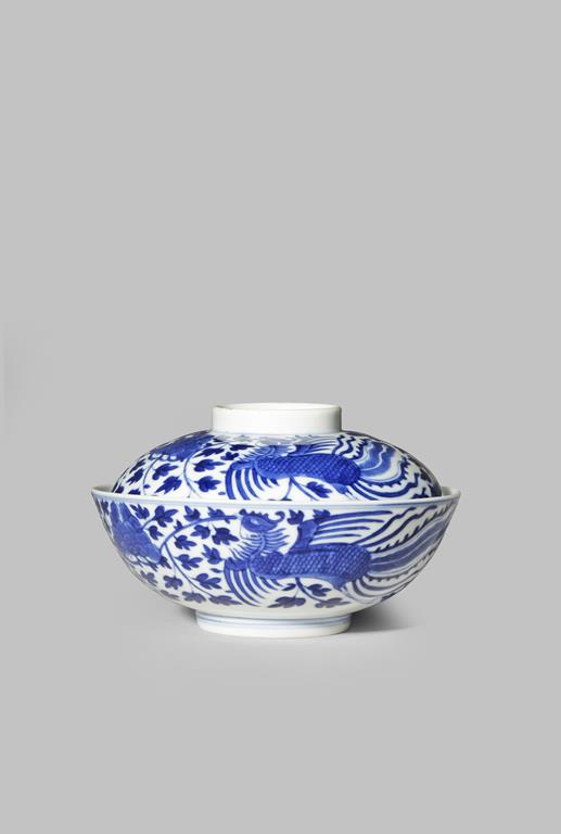 A CHINESE BLUE AND WHITE 'PHOENIX' BOWL AND COVER