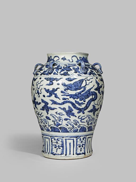 The baluster body decorated with three winged dragons chasing sacred flaming pearls amongst clouds above waves, with four cranes between handles with lion masks above the shoulder, a border of ruyi-heads at the rim and stylised lotus panels to the foot, 42cm.
